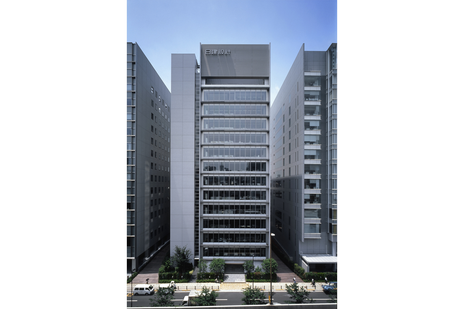 「街路樹のような建築」がコンセプトのこの建物は、カーテンウォールを部分的にへこませ、方立に縦型の換気装置が納められて外観上もすっきりとした印象です。この凹凸によって、 壁面を流れる風をキャッチした換気装置が効率的な室内換気を促します。